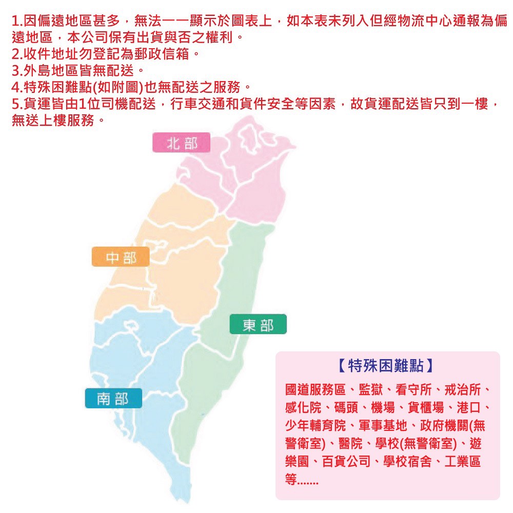 偏遠備註:偏遠地區需加收聯運費且須與合作貨運確認是否有配送,因此偏遠地區的配送,本賣場保有出貨與否之權利。