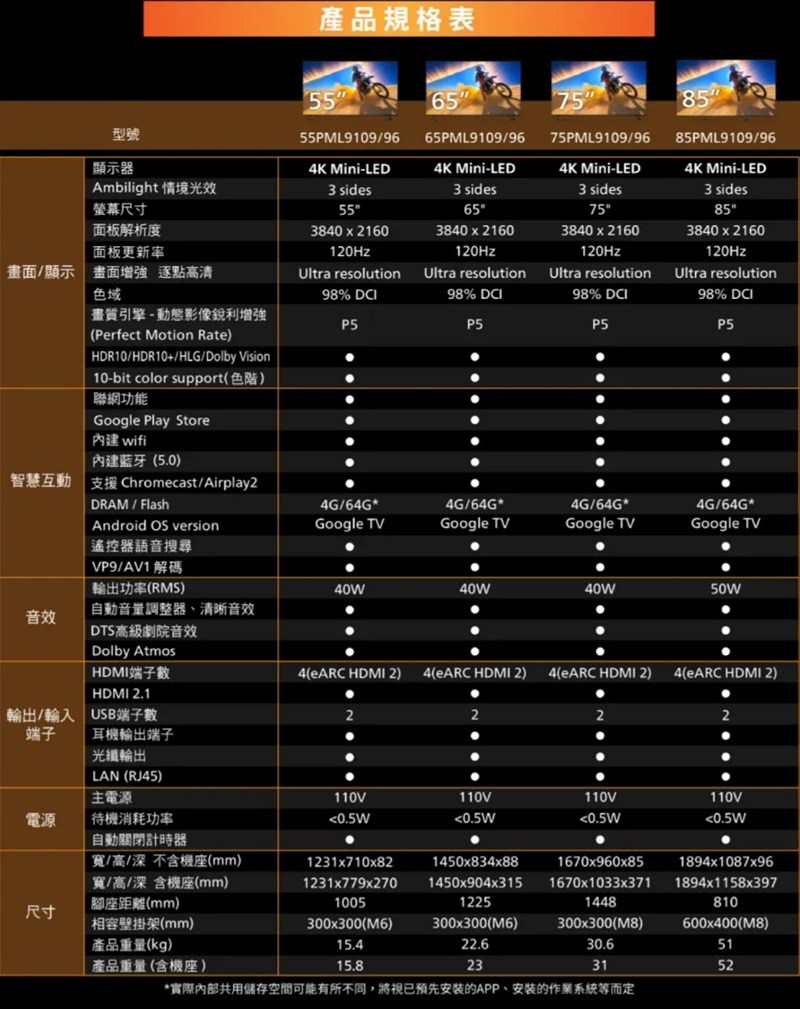 不含安裝 飛利浦 85吋 85PML9109 4K QD Mini LED 120Hz Google TV 智慧顯示器