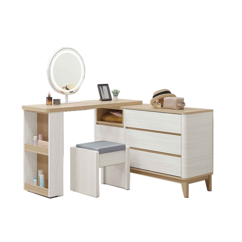 正面 . 側板 . 桌面採用國際低甲醛木心板 表面採專利技術耐磨木紋同調浮雕壓紋 . 觸感猶如實木 側板採用木心板曲線弧形加工一體成型
