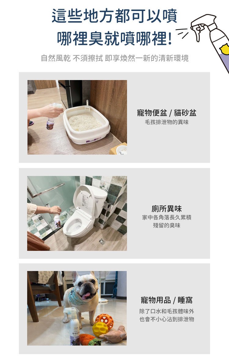 適用範圍:適用於各種材質的除臭,可用於家中地板及各式傢俱,寵物睡窩、便盆、玩具等有異味之處。