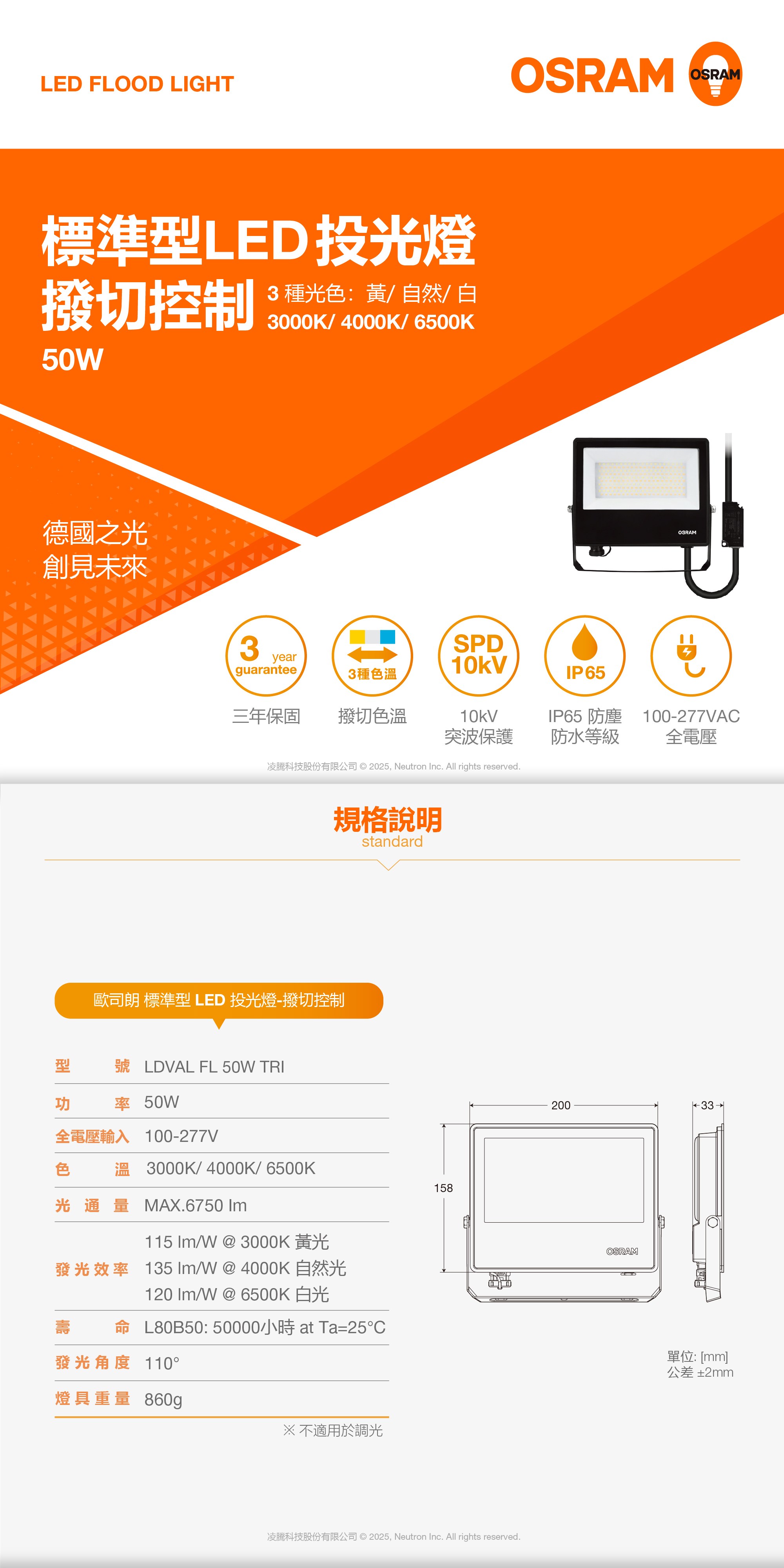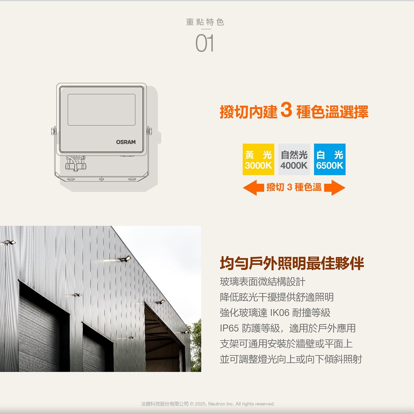 歐司朗 LED50W 277V IP65防水撥切三段色溫 投光燈