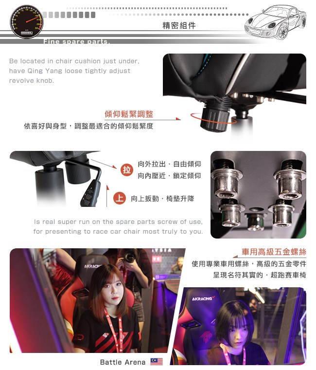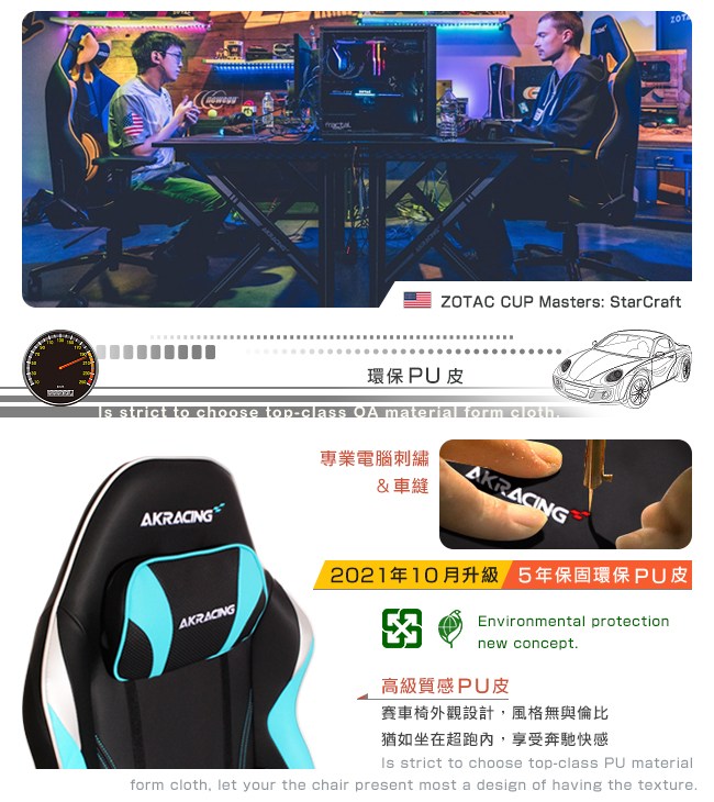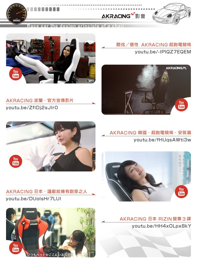 AKRACING倡導時尚前衛,一直引領電競遊戲、超跑賽車、辦公等各領域的座椅設計潮流,注重新型、環保材質的引進。嚴格控制製作過程中的各個環節,立足於現代科技理論與生產實踐相結合。經過不斷的發展,AKRACING擁有了一批極富創意的設計師,和技術精湛的專業製作團隊。AKRACING超跑電競椅,英雄聯盟職業聯賽的指定座椅之一,為電競玩家競相追捧的終極裝備。