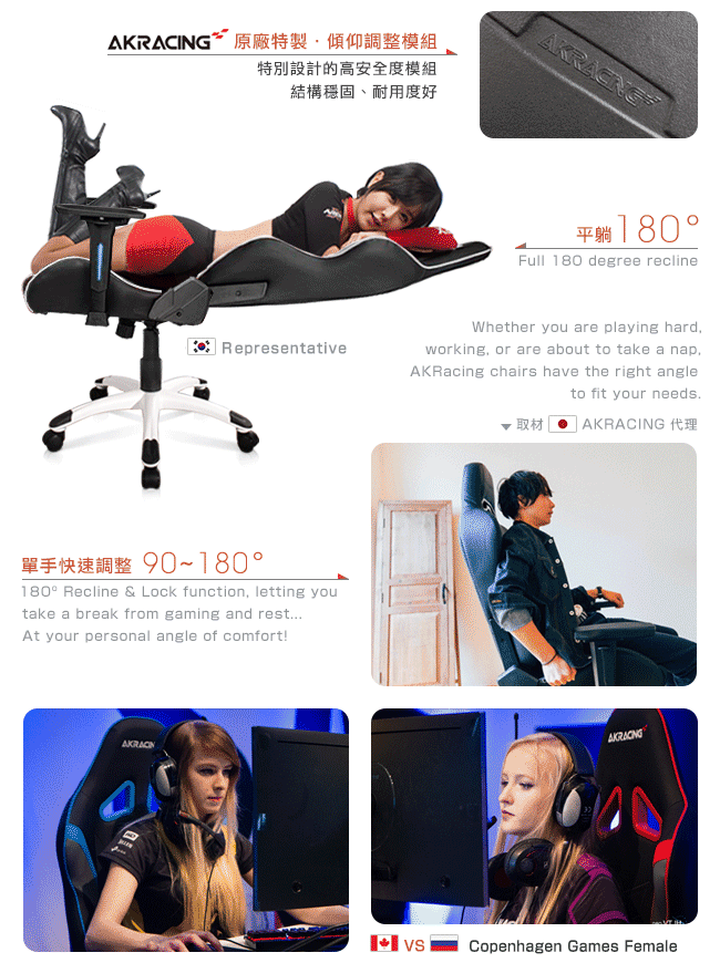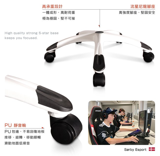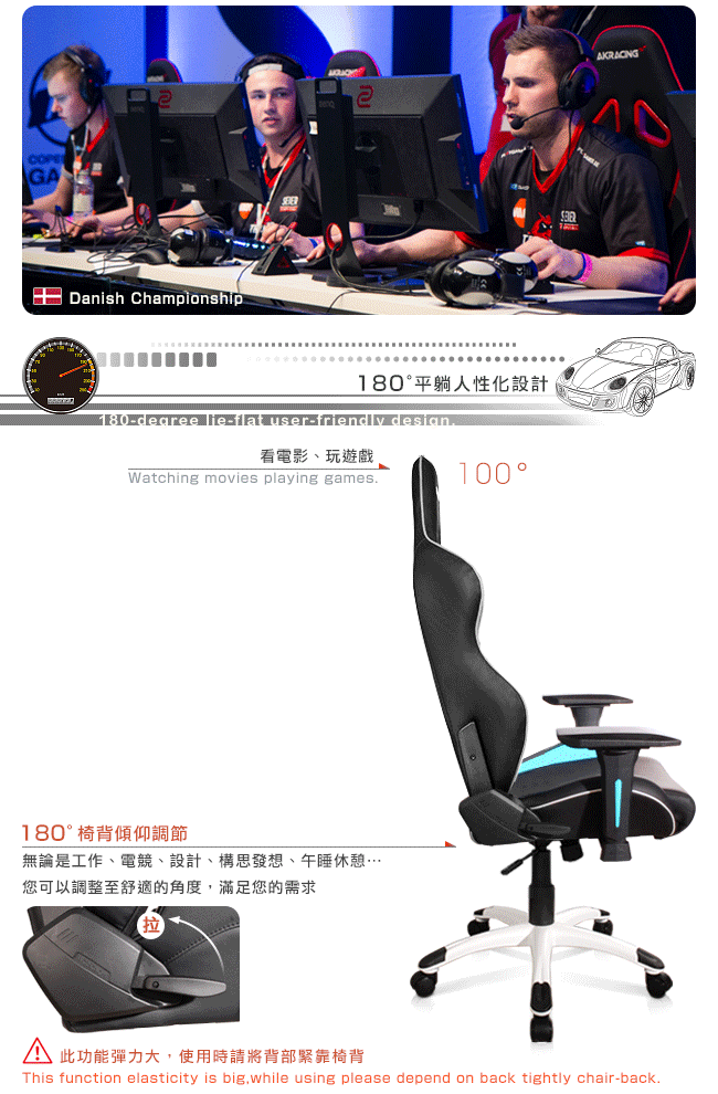 通過國際SGS、德國TUV SUD認證機構的優良品質測試。外銷歐美、日韓、亞洲、南美、紐澳等40餘國,廣受專業人士的歡迎,更是各國職業遊戲比賽的專用座椅。搭配人體工學設計、高密度成型泡綿,曲面座墊具有完美的包裹感,符合臀部和腿部的人體特徵,讓人體和座面之間,緊密貼合在一起,分散壓力,久坐不累,達到放鬆的效果。