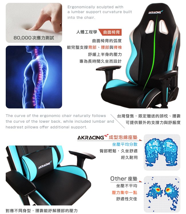 AKRACING從使用者的坐姿,座位高度,腿部壓力均衡,腰部支撐,頸椎支撐,手臂支撐等多個要點,研發出符合人體工學的辦公座椅,使人們在工作與生活中,享受前所未有的健康、舒適、便捷。隨著全球市場不斷繁榮和發展,AKRACING的設計更專業、更精湛、質感更上一層樓。充分體現誠信、實力、創新,建立AKRACING良好形象與口碑。