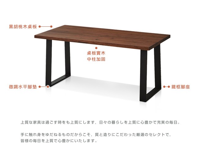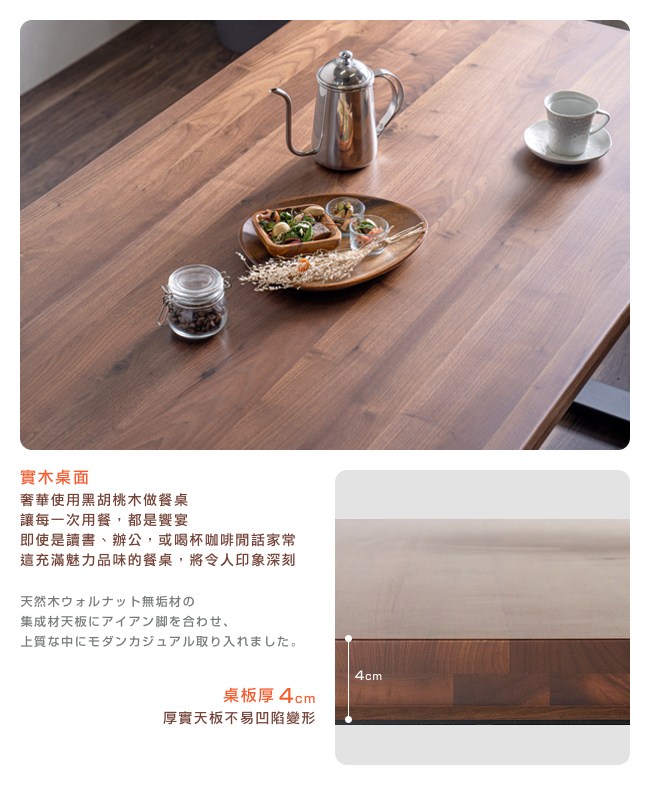 名列世界屈指可數的銘木黑胡桃木,擁有獨一無二的質感「墨流木紋」,沈穩的色調醞釀出高貴不凡的厚實感,質地硬沉,讓每一次用餐,都是饗宴。即使是讀書、辦公,或喝杯咖啡閒話家常,這充滿魅力品味的餐桌,將令人印象深刻。桌板厚 4cm,天板不易凹陷變形;實木中柱加固,提升承重力與穩定度,經久耐用。鐵框腳座,經典工業風,桌腳設計微梯形,視覺與結構四平八穩,穩如泰山。微調水平腳墊,因應地面環境,讓桌面不晃動,且可避免刮傷木質地板、磁磚。