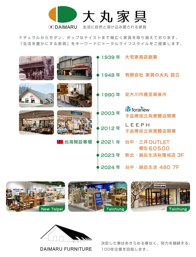 1939 年創業,2003 年子品牌「foranew」成立、2012 年子品牌「LEEPH」成立,2021 年在台灣設立專櫃。秉持著「豐富生活的家具」為原則,主要嚴選 500 年生的北美黑胡桃木來製造家具,我們希望滿足每個人對於居家的需求,設計出更令人喜愛的高品質家具。我們會繼續努力,讓家具與時俱進、推陳出新,立志成為百年歷史的公司,並堅持嚴謹的生產過程,只給客人最好的家具。