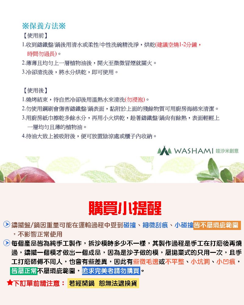 1.收到鑄鐵盤/鍋後用清水或柔性/中性洗碗精洗淨,烘乾(建議空燒1-2分鐘,時間勿過長)。