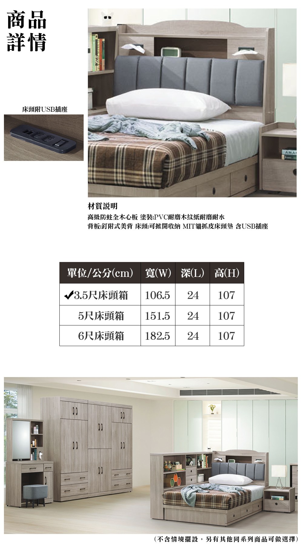 【顛覆設計】瑞絲收納格插座靠枕床頭片(單大3.5尺)