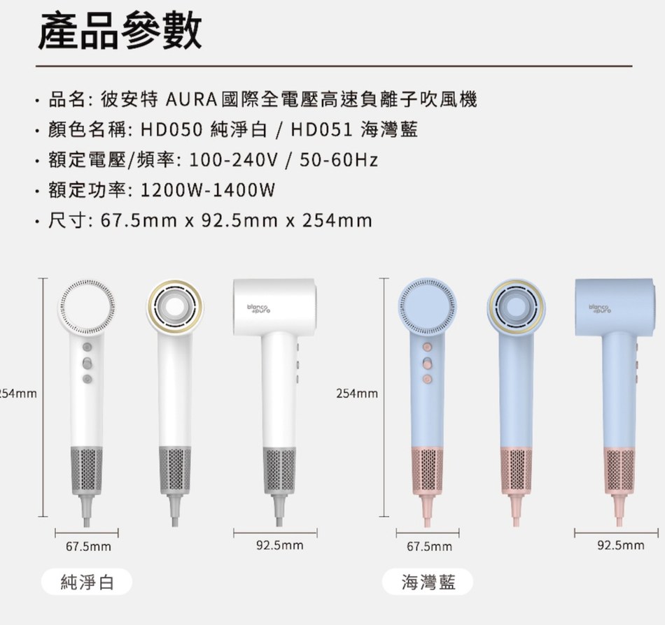 彼安特 AURA HD050 白 / HD051 藍 全電壓高速負離子吹風機純淨白 HD050