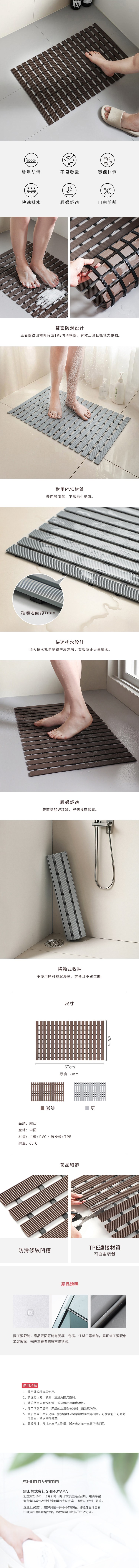 SHIMOYAMA 折疊式PVC浴室防滑排水墊/止滑墊 灰色 1個 67 x 43 x 0.7cm