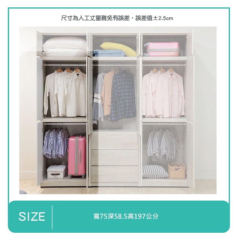 直人木業-北歐白楓木高被櫃衣櫃225公分(配色雙門75公分+三抽75公分+全白雙門75公分)