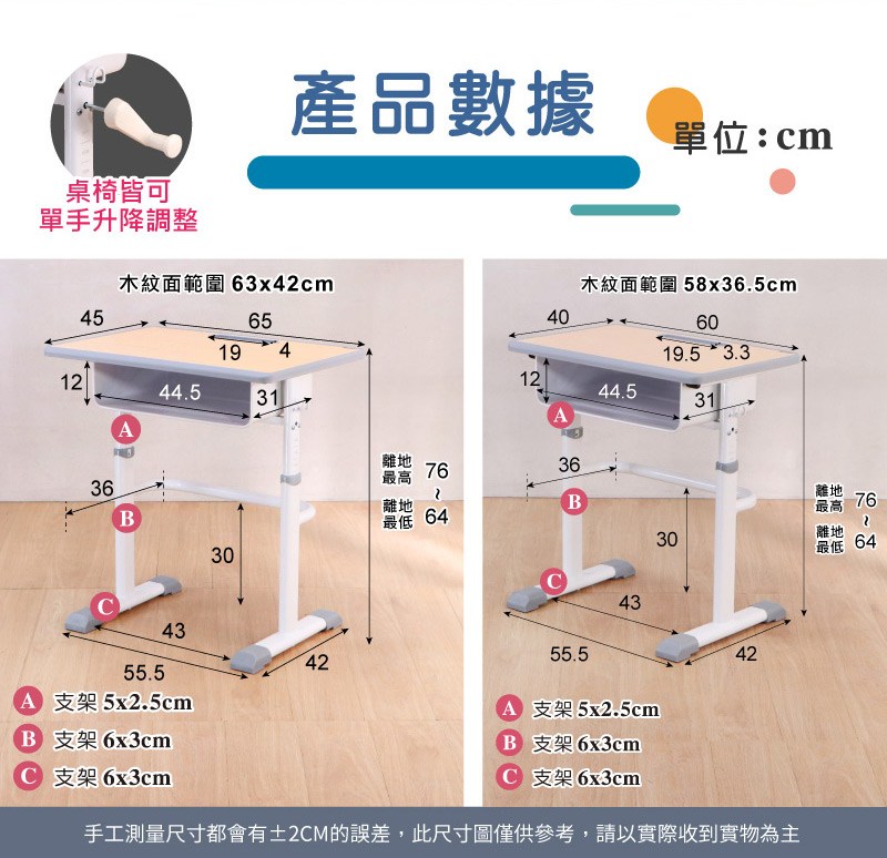 小款桌子:60 x 40 x桌面離地最低64cm / 離地最高76cm (詳細如附圖)