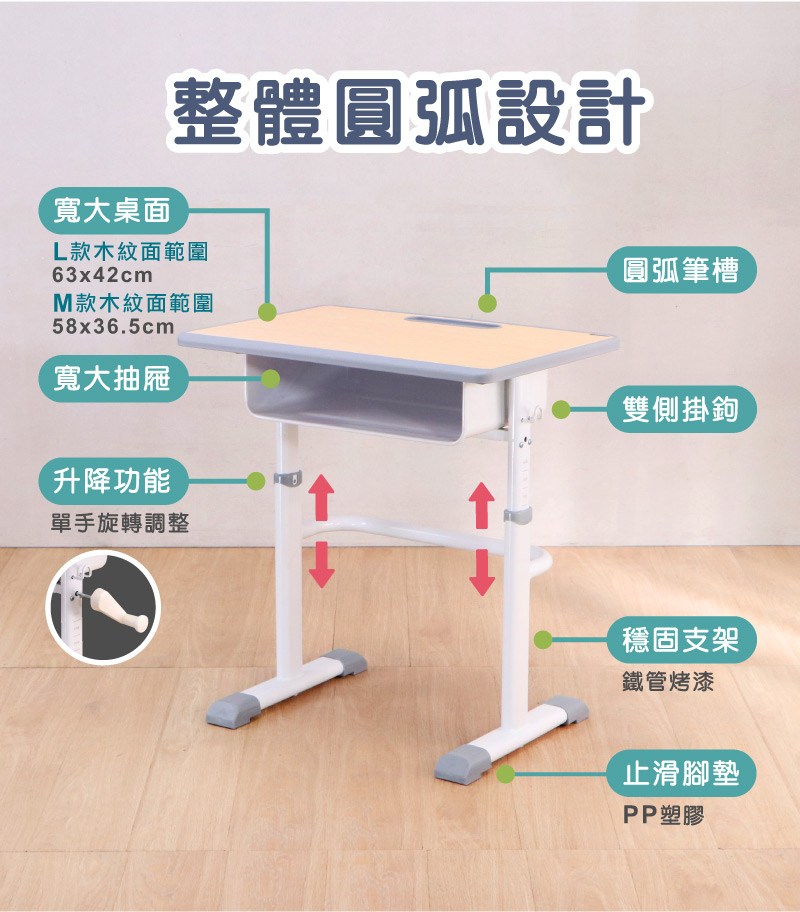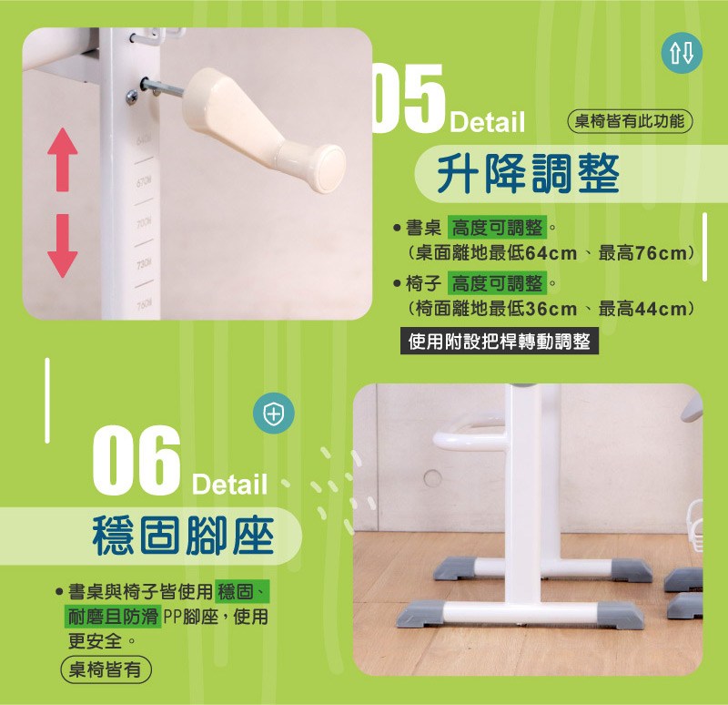 使用調節把桿可輕鬆單手調整桌子高度,靈活配合孩子的成長需求與不同情境。