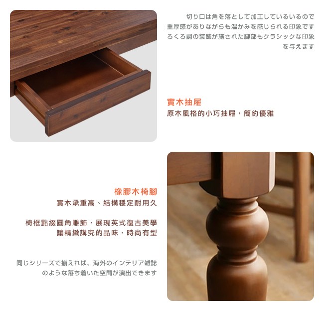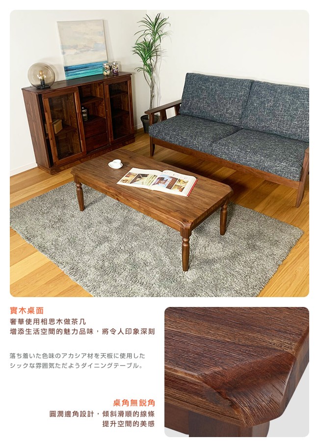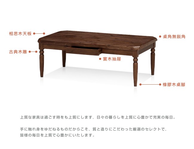 奢華使用相思木做茶几,增添生活空間的魅力品味,講令人印象深刻。桌角無銳角,傾斜滑順的線條,提升空間的美感。原木風格的小巧抽屜,簡約優雅。橡膠木實木腳,點綴圓角雕飾,展現英式復古美學,讓精緻講究的品味,時尚有型。