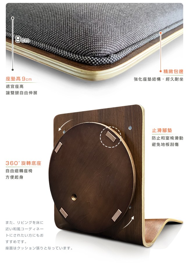 圓潤造型,無銳角設計,適合放置於和室空間,使用手機、觀賞電視、閱讀書籍、品茗聚餐,都能輕鬆依靠,帶來安全舒適且溫馨的感受。椅背的鏤空把手,圓弧安全造型,不刮手好握好提,方便搬移座椅。壓克力布,外觀質感良好,手感柔軟,耐用性佳。成型泡綿,紮實彈性,耐用久不易形變,讓和室椅舒服好坐。精緻包邊,強化座墊結構,經久耐坐。底座止滑腳墊,防止滑動,避免地板刮傷。