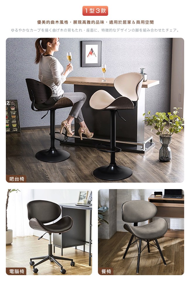 經由層疊、熱壓成形的工藝,將一片片實木製成優美的曲木椅背,展現高雅的品味,適用於居家&商用空間。高密度泡綿順著弧度彎曲,絕佳的包覆感,因而舒適好坐。實木鐵線腳座,在美學與功能之間,交織時尚的結構,承重高、穩固不移。防刮塑膠腳墊,避免刮傷木質、磁磚地板。