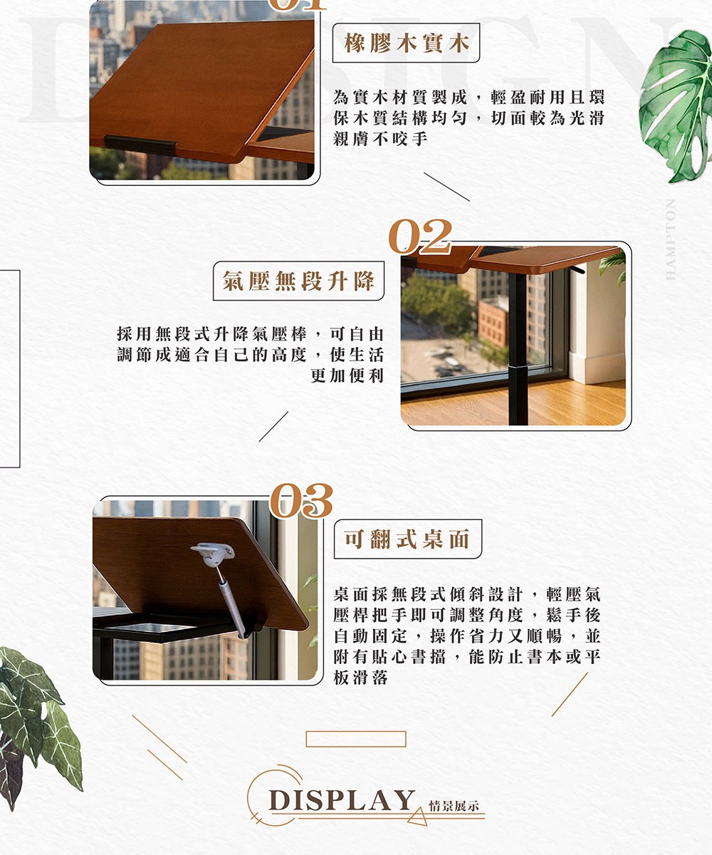 【Hampton 漢汀堡】查理實木氣壓桌面可翻升降桌-白腳
