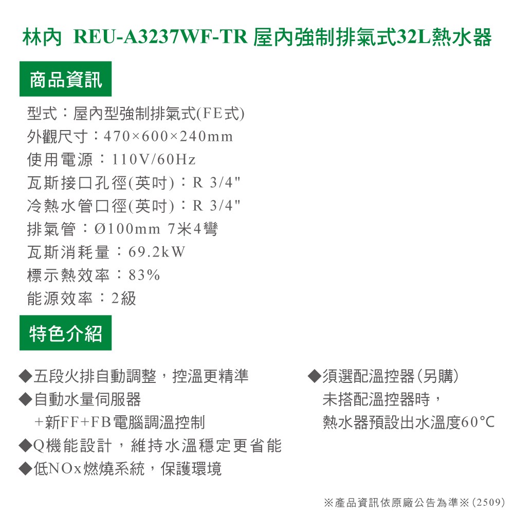 (全省安裝)林內32公升屋內強制排氣(與REU-A3237WF-TR同款)FE式熱水器天然氣REU-A3237WF-TR-NG2