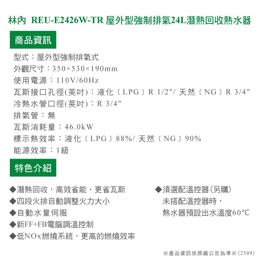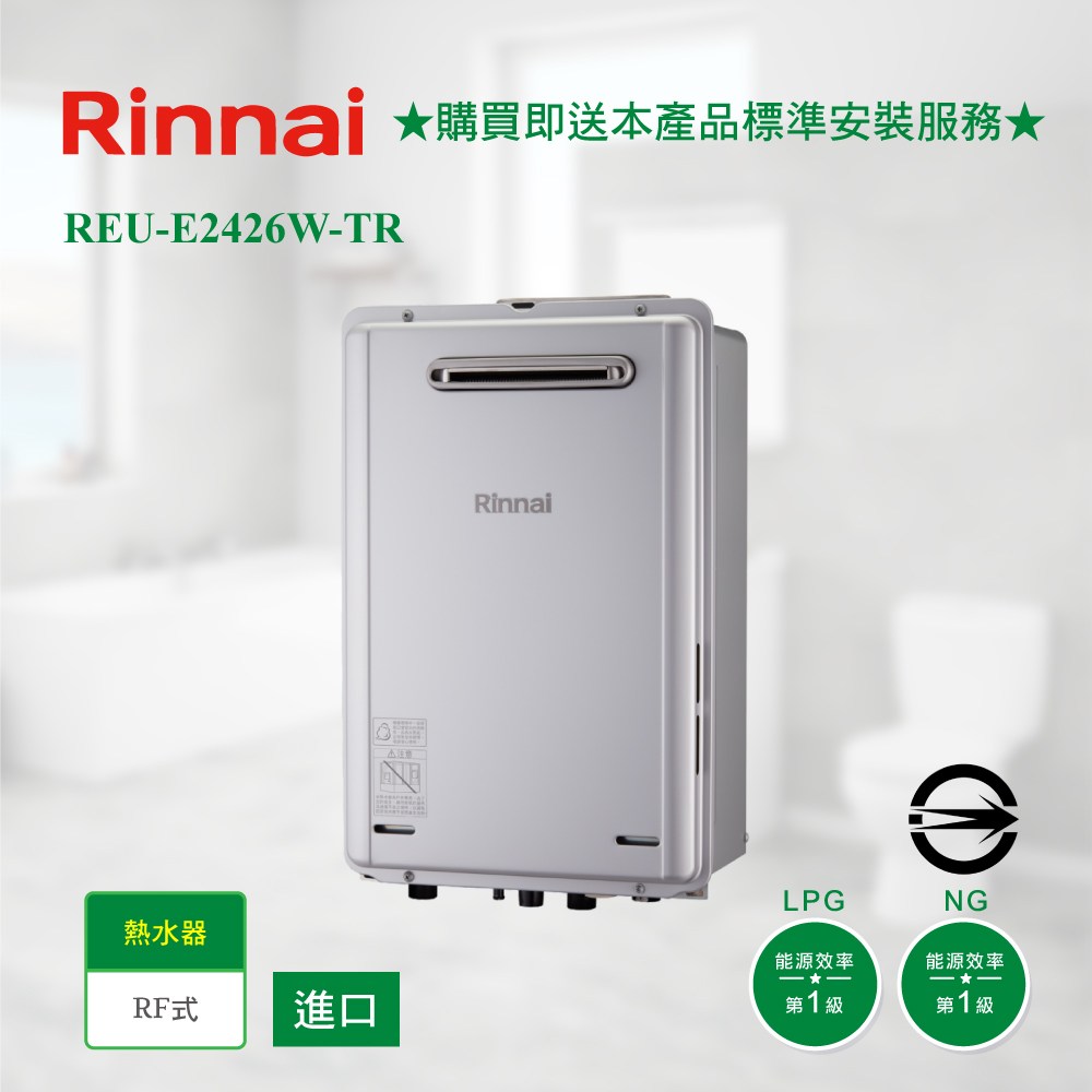 [林內] REU-E2426W-TR屋外型強制排氣24L潛熱回收熱水器_天然NG1/RF式(日本原裝進口)天然瓦斯