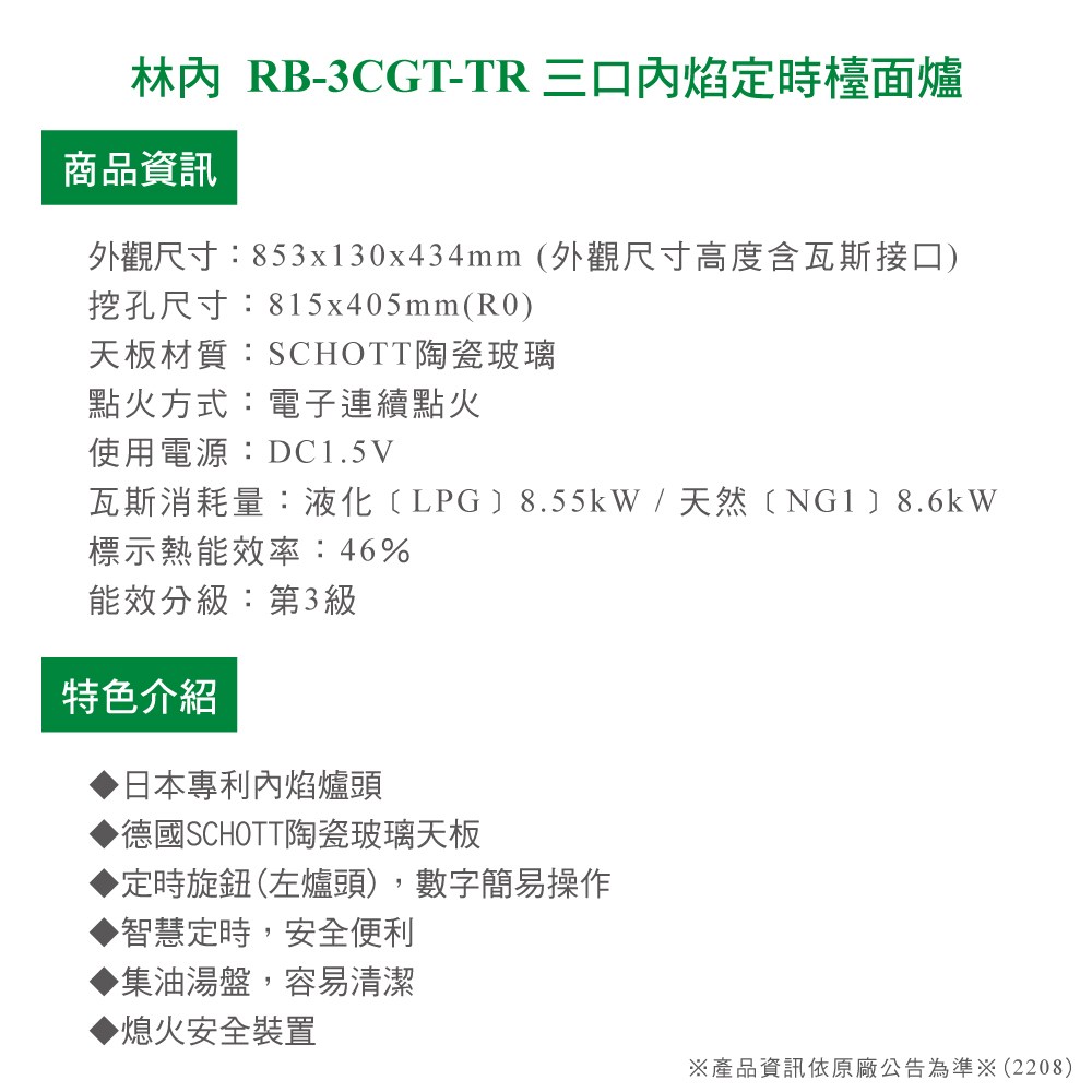 (全省安裝)林內檯面爐內焰爐三口爐瓦斯爐桶裝瓦斯RB-3CGT-TR_LPG