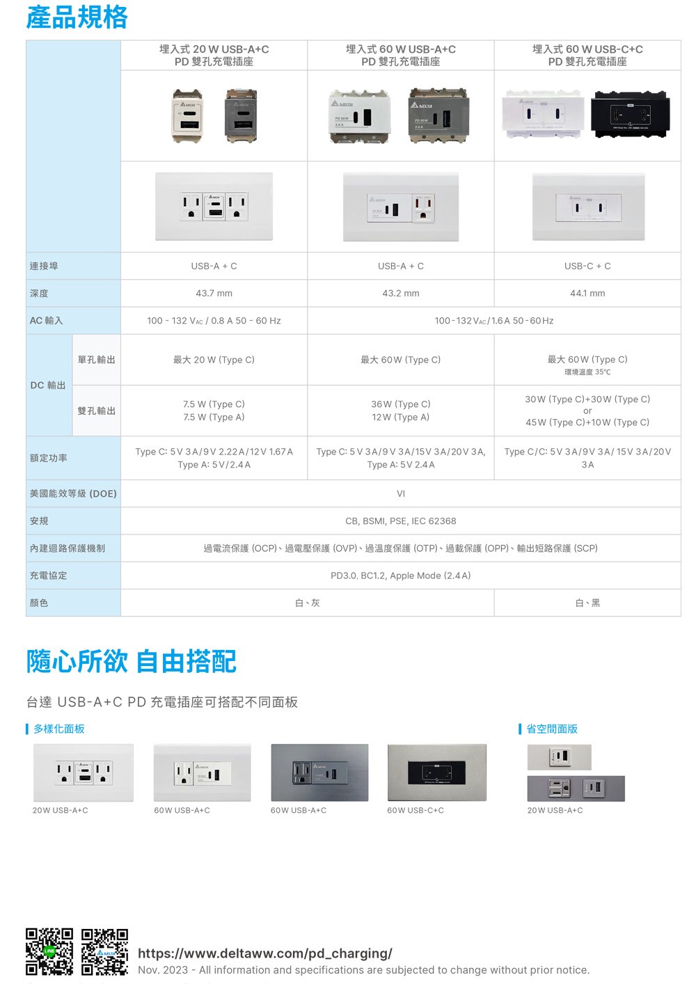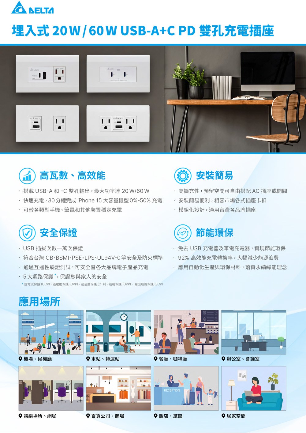 台達 PD款充電插座(TypeA+TypeC)雙孔單品 EUSB-60NWE D