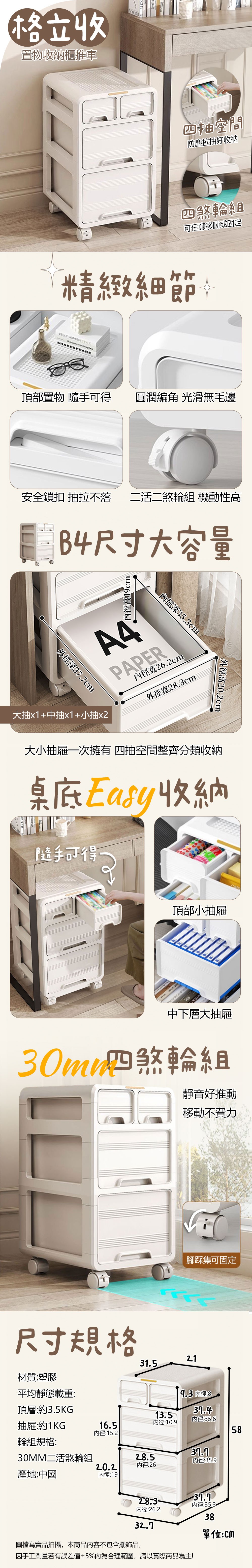 【品樂生活】免組裝 格立收置物收納櫃 附輪 FC3458-WT 文件櫃 收納推車 塑膠推車 美容推車 抽屜櫃