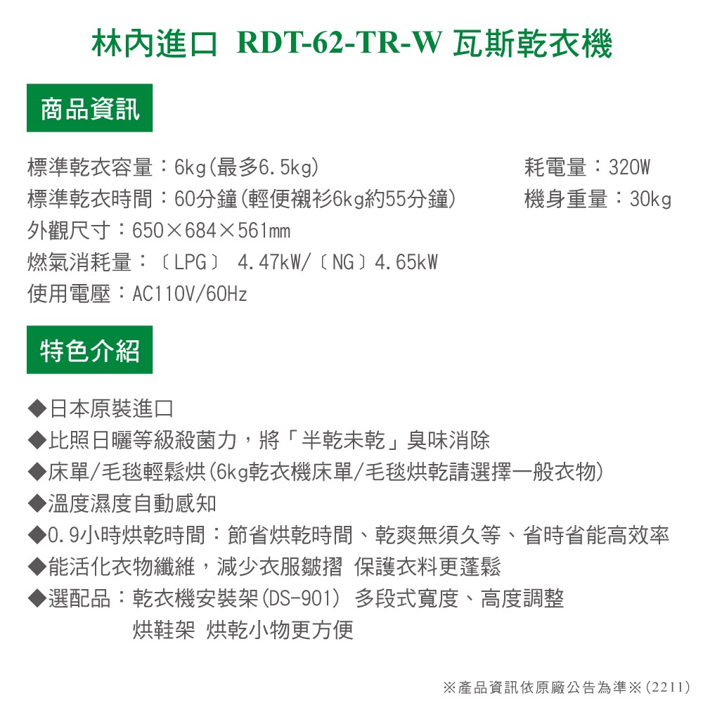 (全省安裝)林內6公斤瓦斯乾衣機RDT-62-TR-W_LPG ★送陶板屋餐券4張