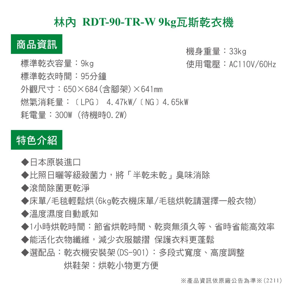[林內] RDT-90-TR-W 9KG瓦斯乾衣機_天然NG1(日本原裝進口)天然瓦斯