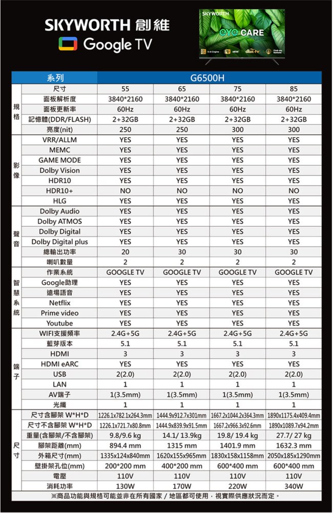 SKYWORTH創維 55型 4K Google TV聯網顯示器 55G6500H 含標準安裝