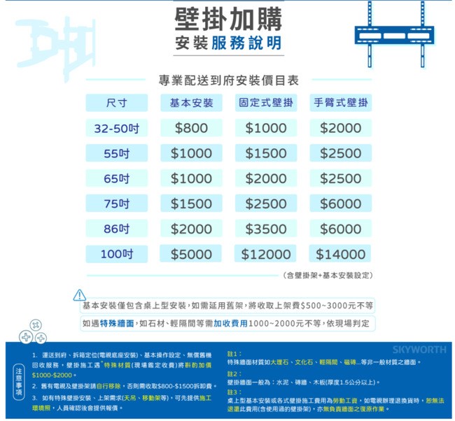 基本安裝 SKYWORTH 創維 55吋 55Q660G 4K QLED Google TV 聯網顯示器