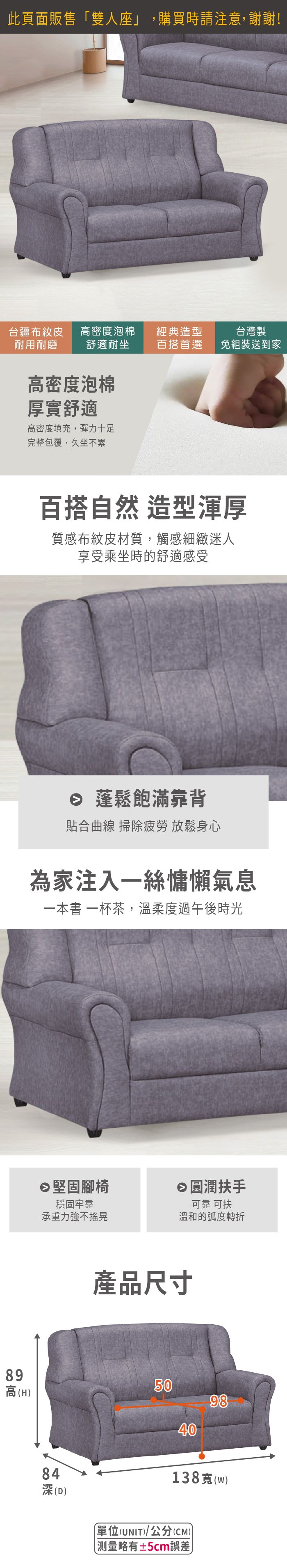 綠活居 雷凱時尚灰亞麻耐磨皮革二人座沙發椅-138x84x88cm免組