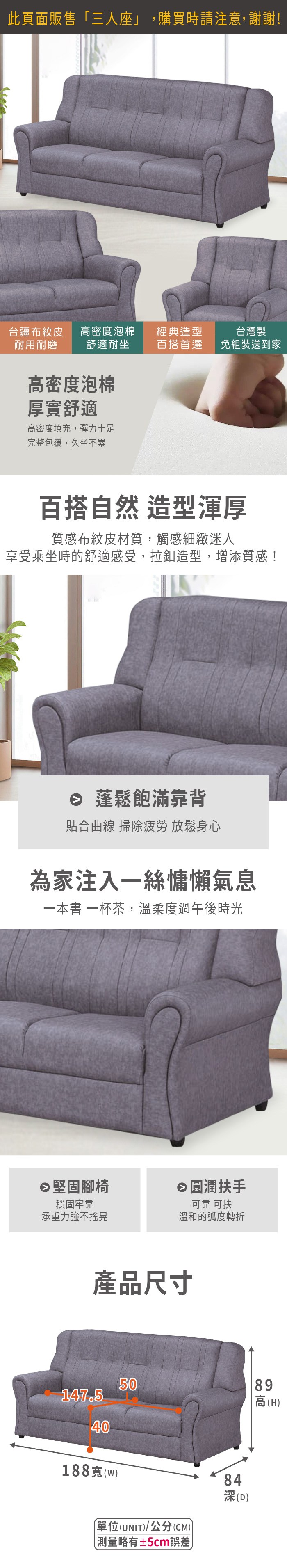 綠活居 雷凱時尚灰亞麻耐磨皮革三人座沙發椅-187x84x88cm免組
