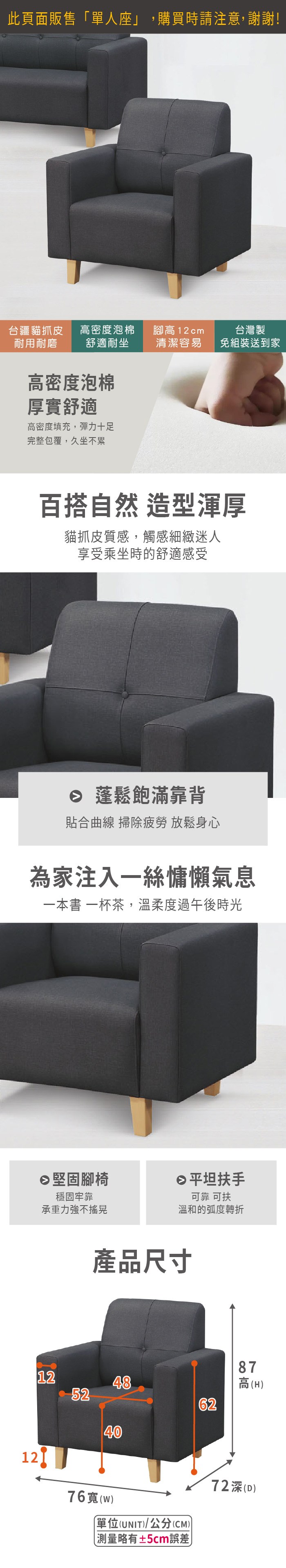 【本木】宇智波 台灣製簡約舒適1人坐沙發-雲灰色#6710