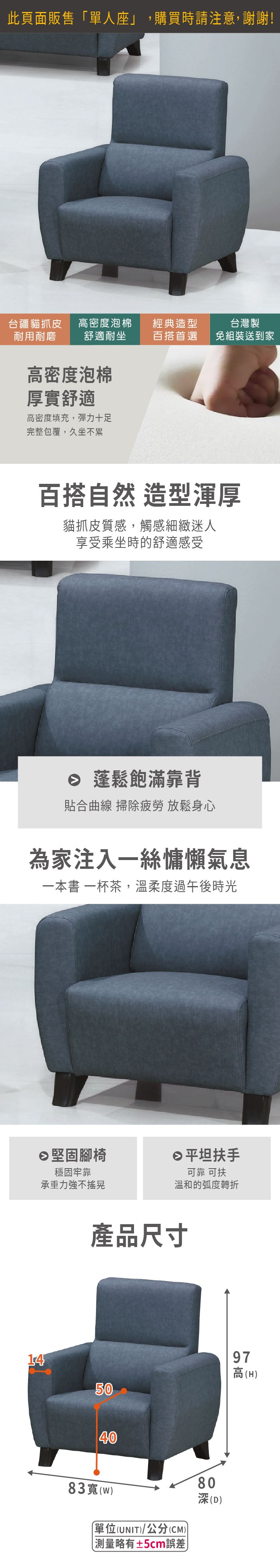 IHouse-大麥克 飽滿回彈貓抓皮沙發 1人座牛仔藍#5373