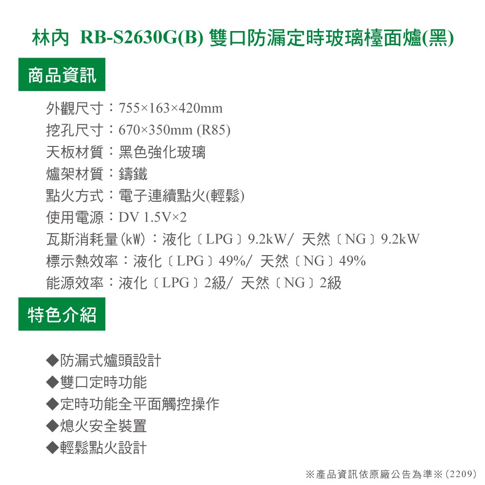 (全省安裝)林內檯面式防漏爐二口爐瓦斯爐RB-S2630G(B)_NG1
