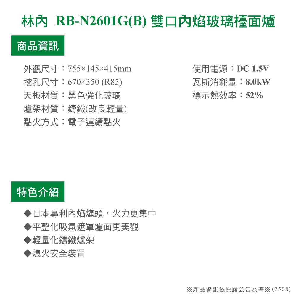林內檯面式防漏雙口爐強化玻璃黑色 天然/液化 RB-202GH(B) 合格瓦斯承裝業 全省免費基本安裝(離島及偏遠鄉鎮另計)