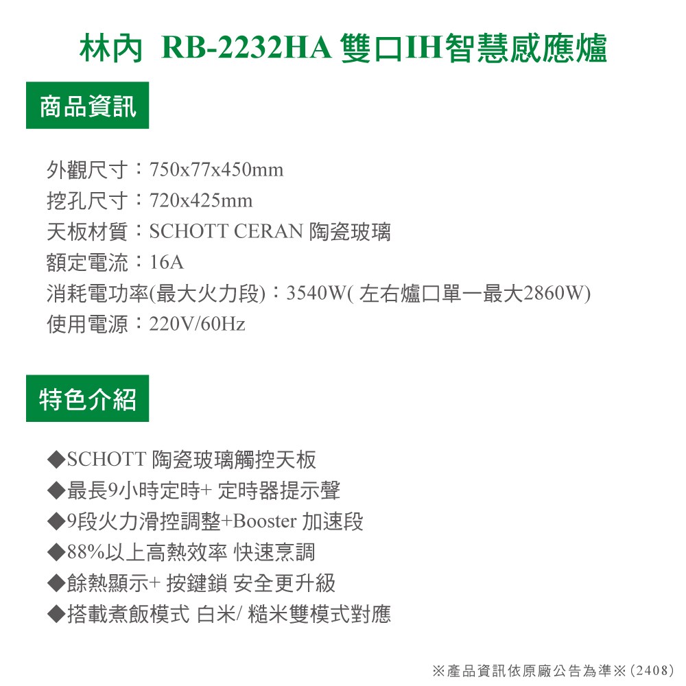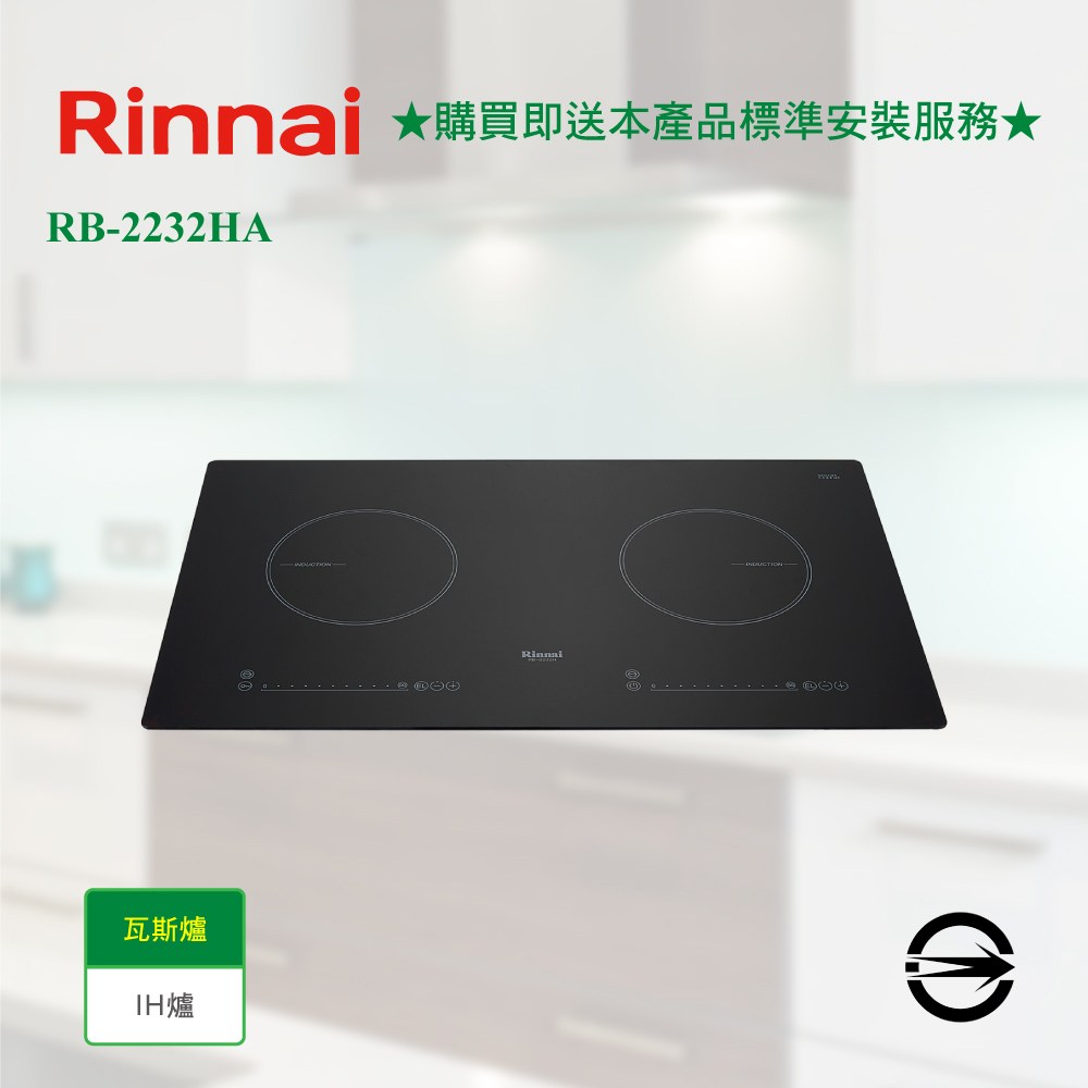 [林內] RB-2232HA雙口IH智慧感應爐 (炊飯功能+SCHOTT陶瓷玻璃)