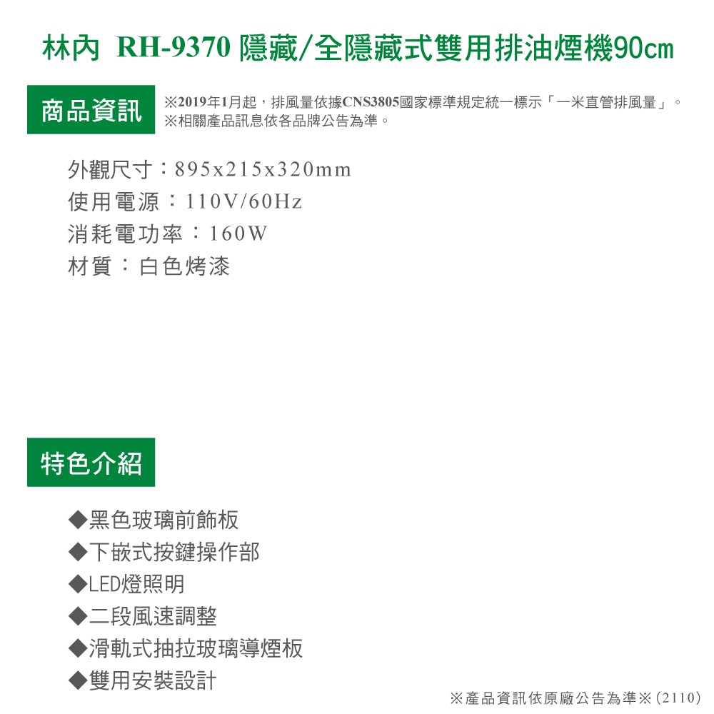 (全省安裝)林內隱藏式90公分排油煙機RH-9370