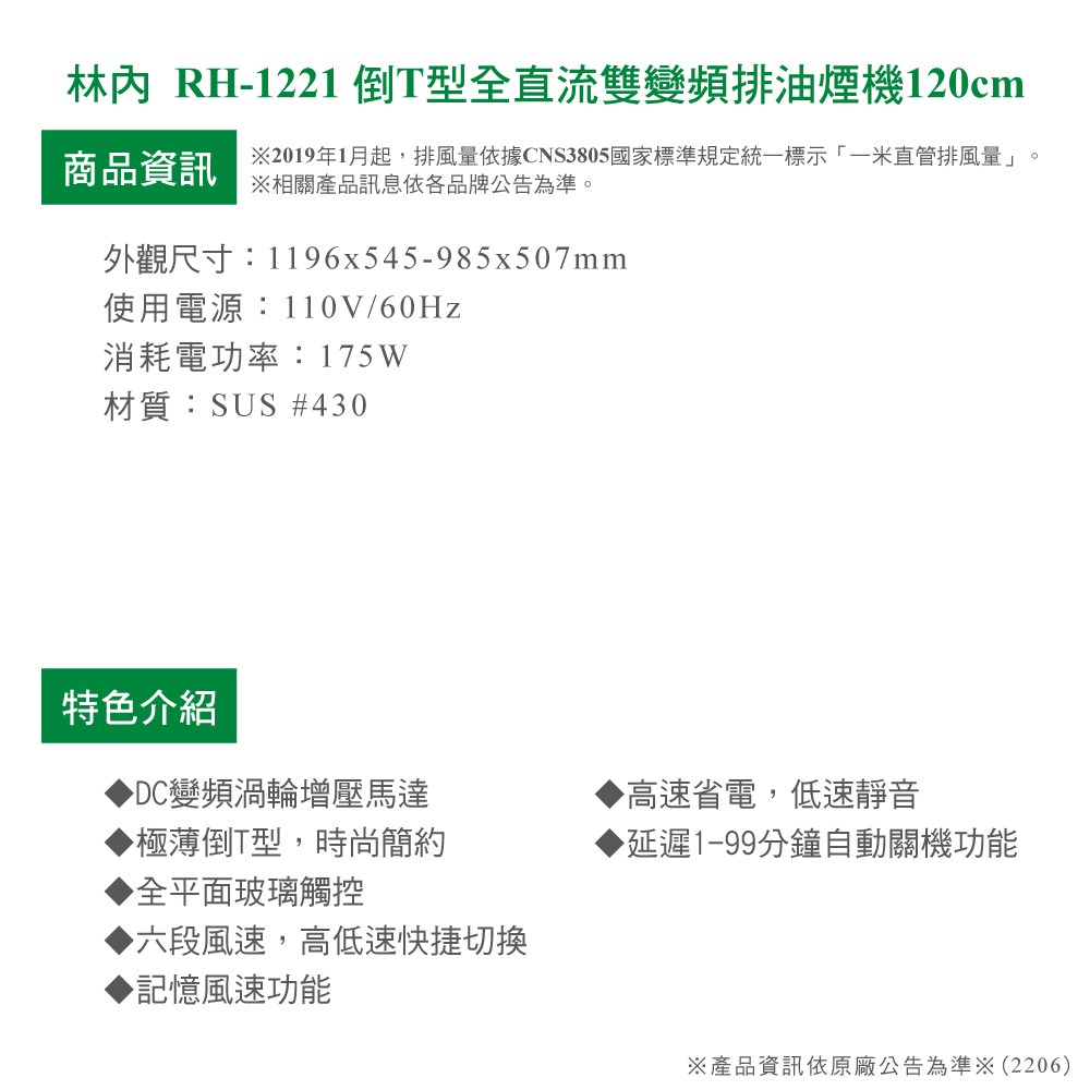 [林內] RH-1221倒T型全直流雙變頻排油煙機120cm
