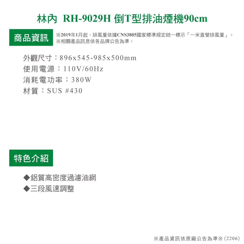 林內倒T式4D直吸油煙機90cm(連動)/RH-9391R 全省免費基本安裝(離島及偏遠鄉鎮另計)