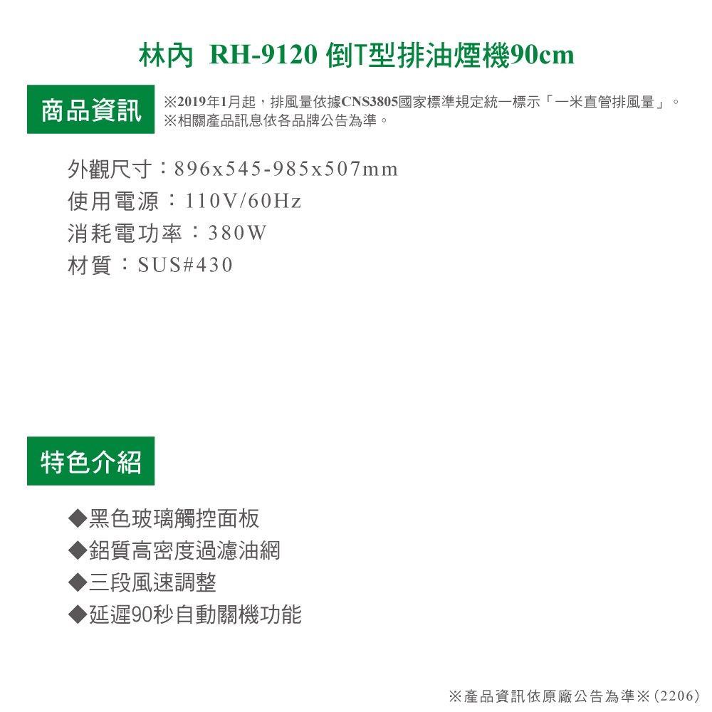 (全省原廠安裝)林內RH-9120倒T型觸控面板排油煙機 高速馬達 歐化排油煙機 不銹鋼除油煙機【APP 4%回饋】 結帳9折
