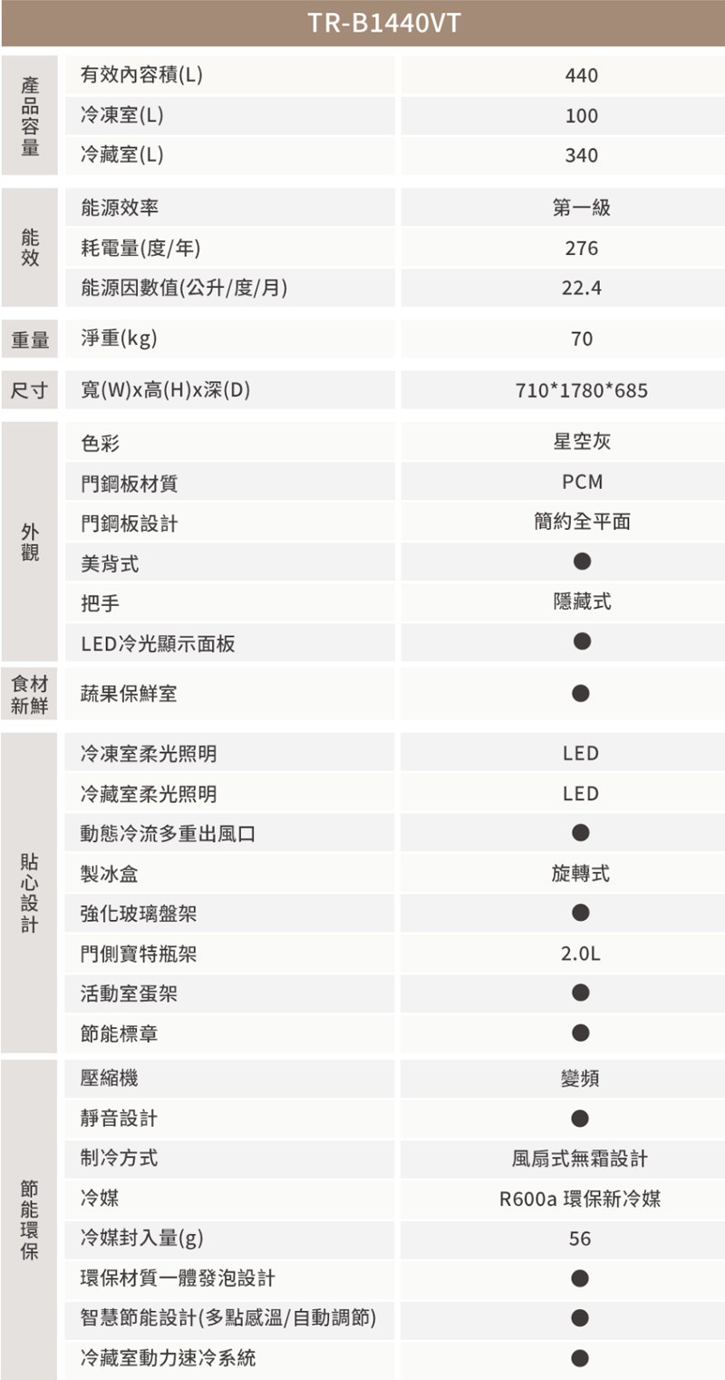 ◎有效內容積:440公升 (冷凍室100L/冷藏室340L)
