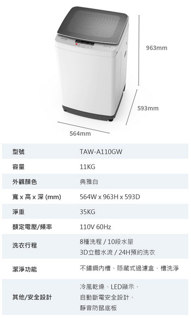 TATUNG大同11公斤定頻單槽洗衣機 TAW-A110GW~含基本安裝+舊機回收