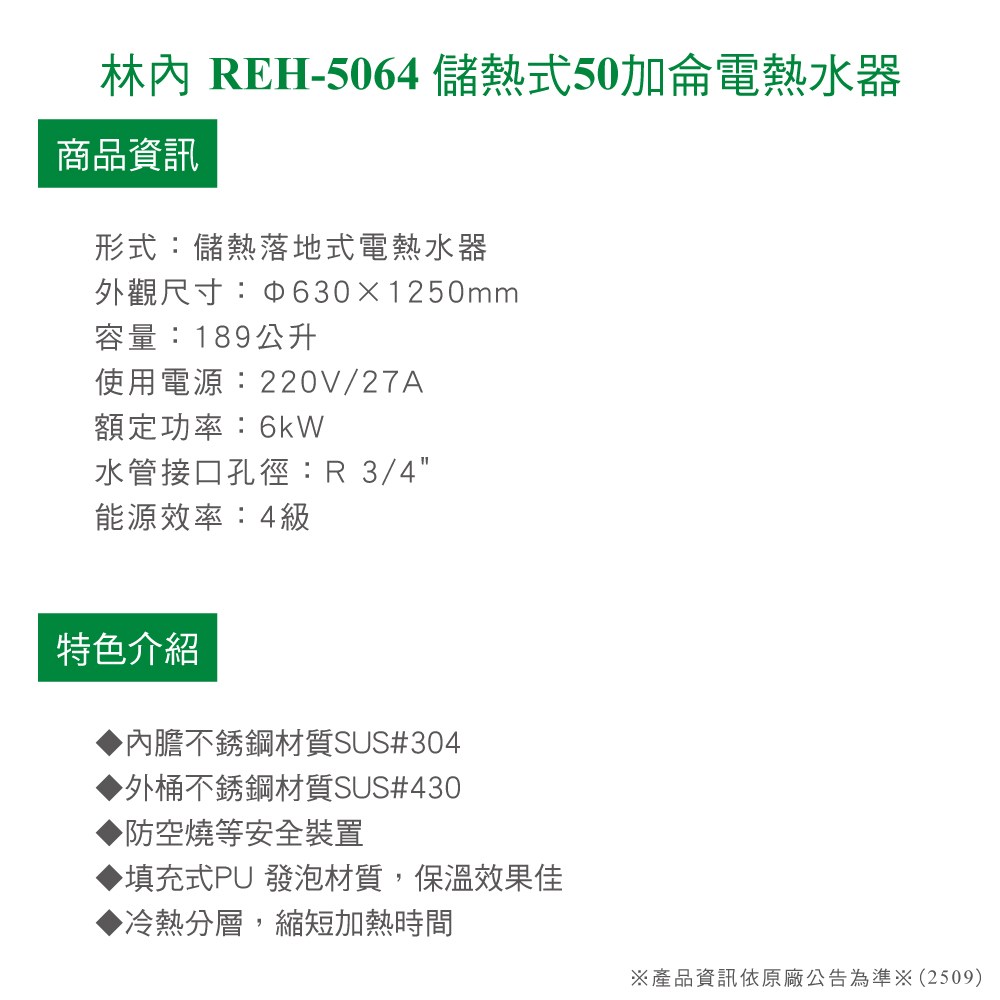 (全省原廠安裝)林內 儲熱式電熱水器30加崙 REH-3063 不鏽鋼內膽 結帳9折