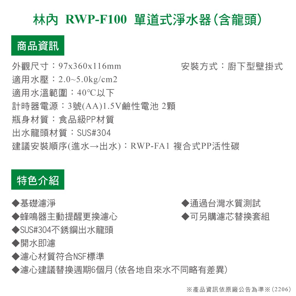(含標準安裝)林內【RWP-F100】廚下型單道式淨水器 (含龍頭)