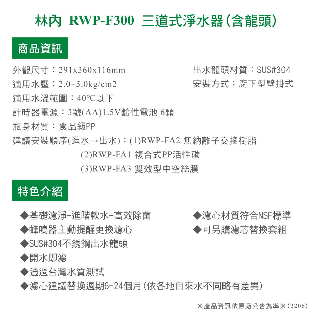 (含標準安裝)林內【RWP-F300】廚下型三道式淨水器 (含龍頭)