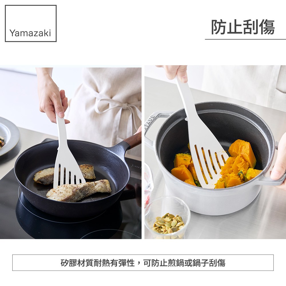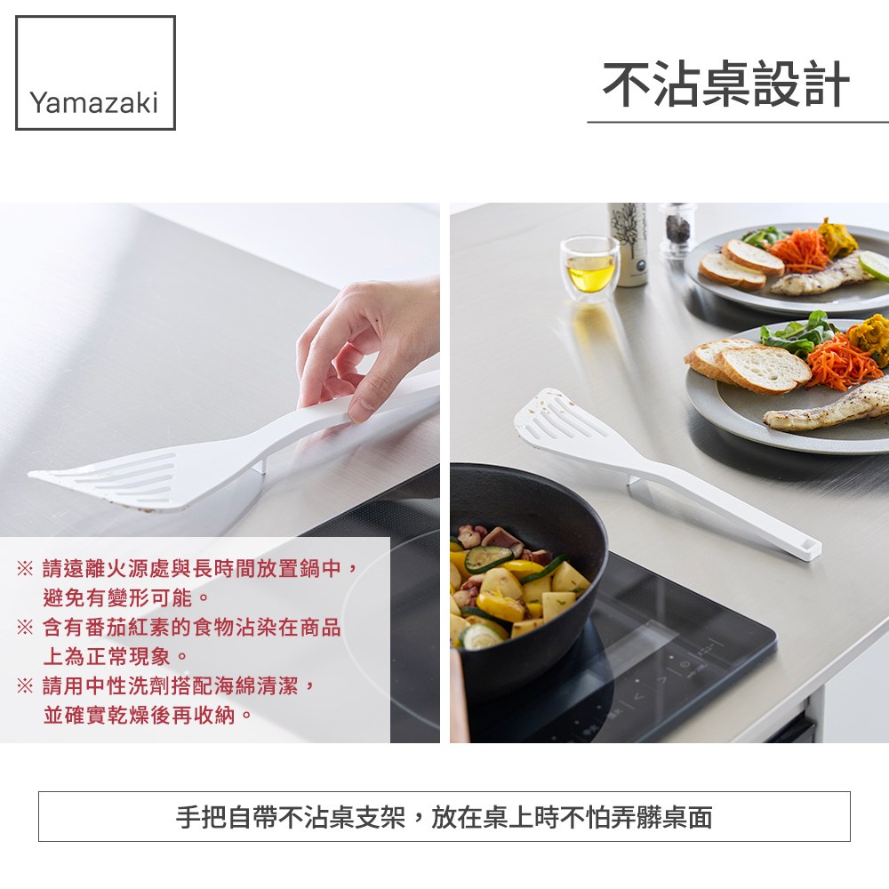 矽膠材質耐熱有彈性,可防止煎鍋或鍋子刮傷,手把自帶不沾桌支架,放在桌上時不怕弄髒桌面。