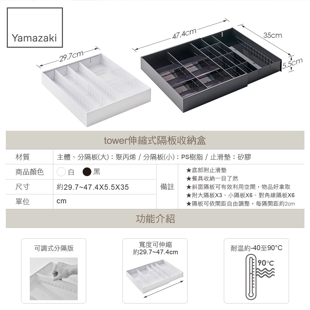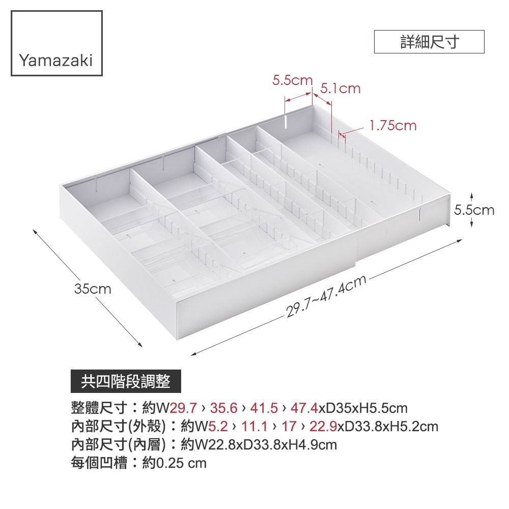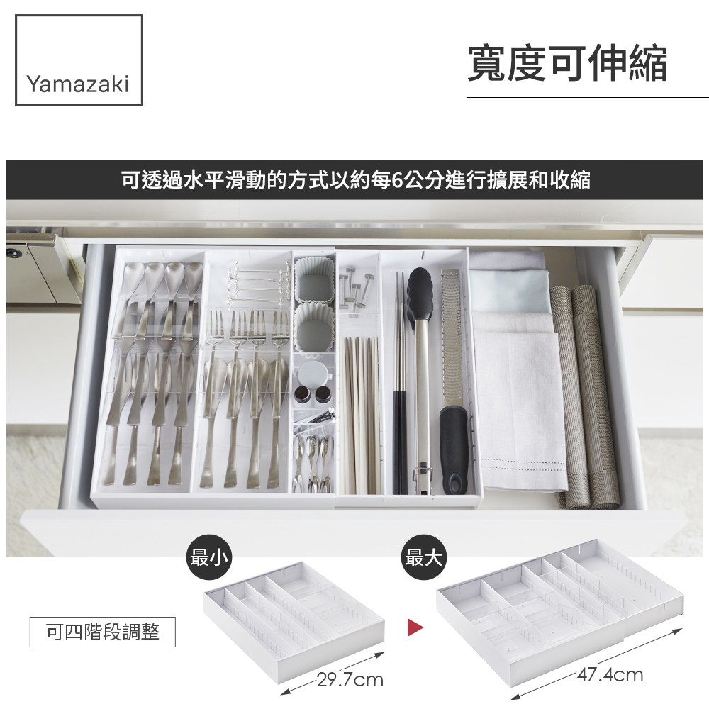 可以透過水平滑動的方式以約每6公分(29.7/35.6/41.5/47.4 公分)進行擴展和收縮,調整至適當抽屜的寬度。