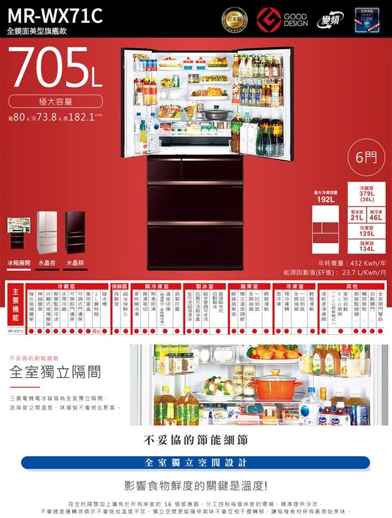 MITSUBISHI 三菱 705公升 日本原裝變頻六門電冰箱 MR-WX71C