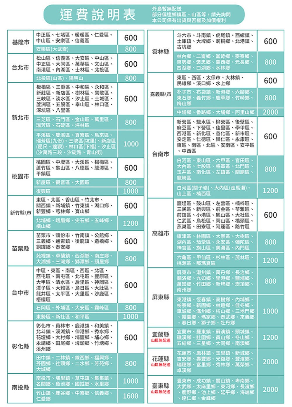 • 偏遠地區之限制:實因特殊地型限制及偏遠地區(山區、濱海鄉、鎮、村、區)無法送貨時,本公司保有出貨與否之權利(下單後會由專人告知是否可配送)。